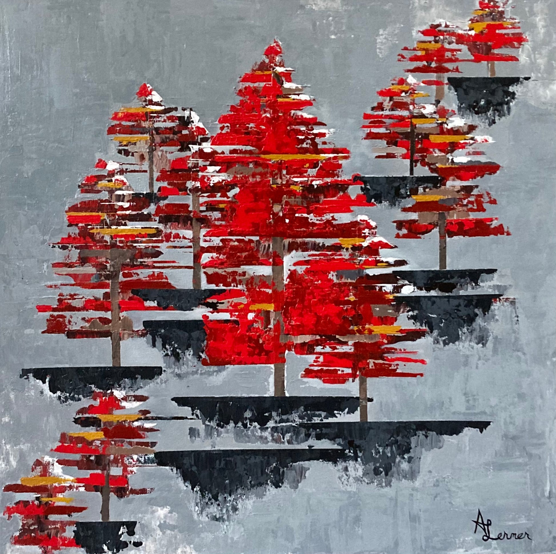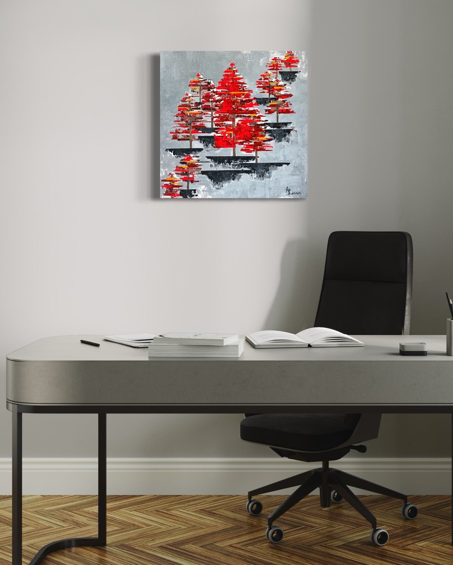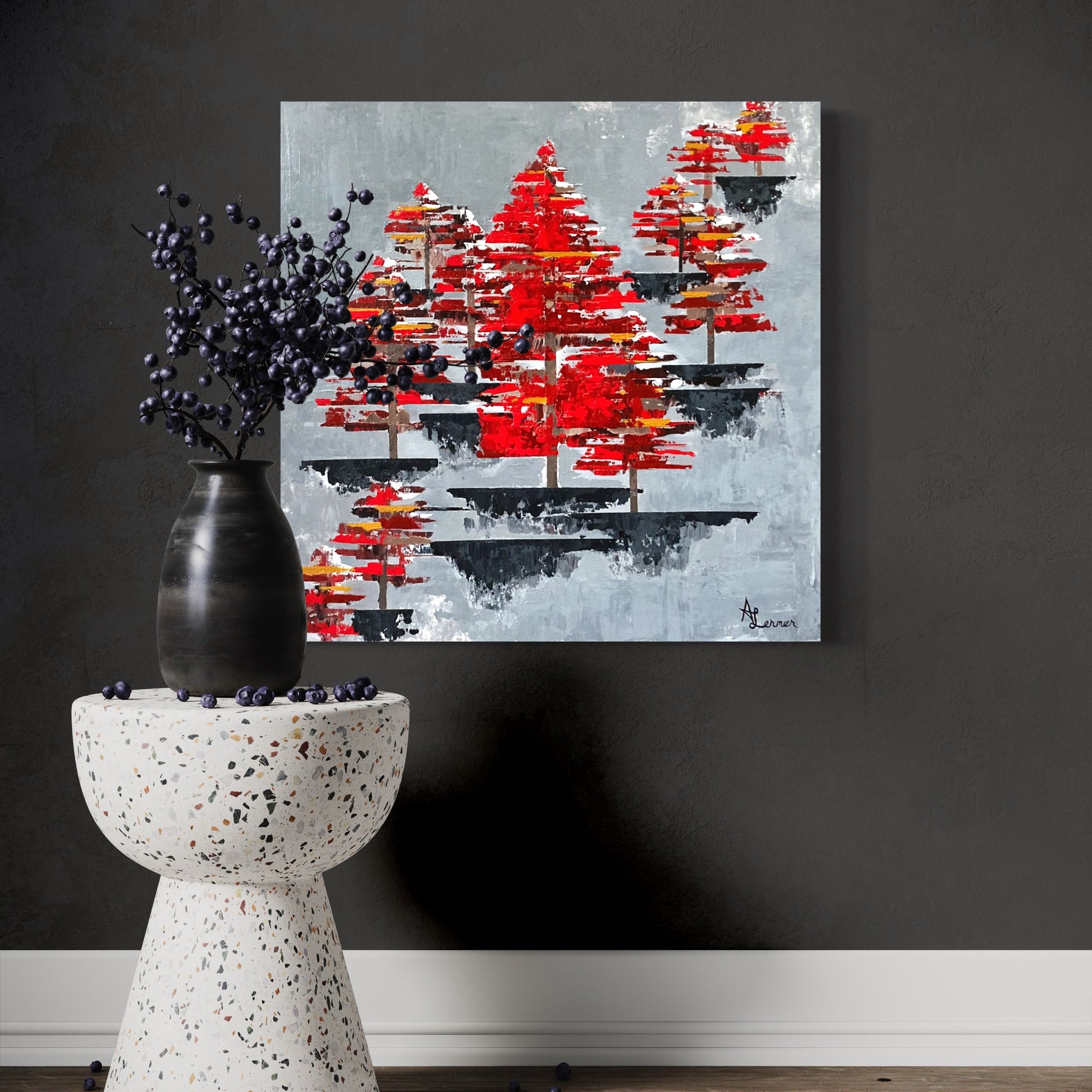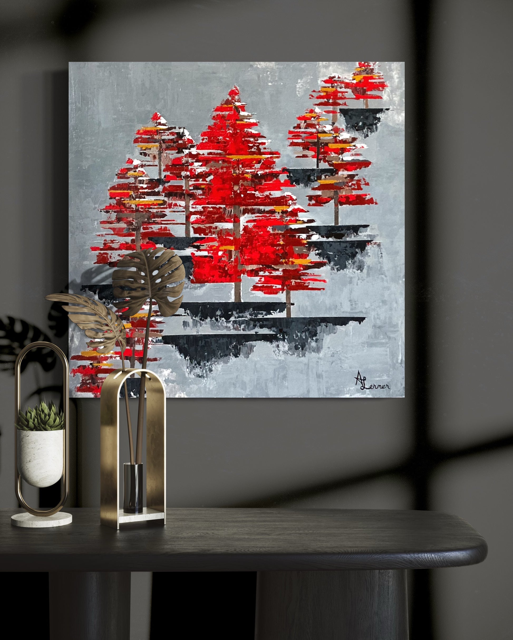 This stunning original acrylic on canvas titled "Red Forest" features a vibrant abstract design with sharp colors. The use of color creates a sense of depth and movement, making it a striking addition to any space. Made with high-quality materials, this piece is sure to add a touch of sophistication to your home or office.