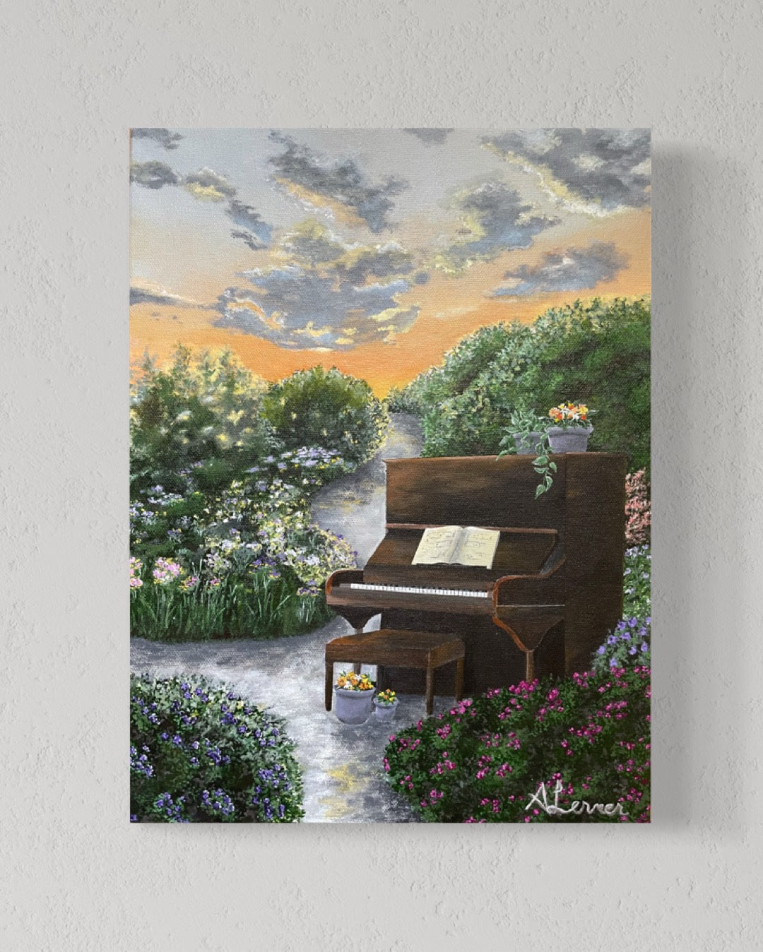 Experience the serene beauty of Sunset Melody, a stunning painting depicting a colorful sunset scene in a peaceful garden. Perfect for bringing a sense of tranquility to any room.