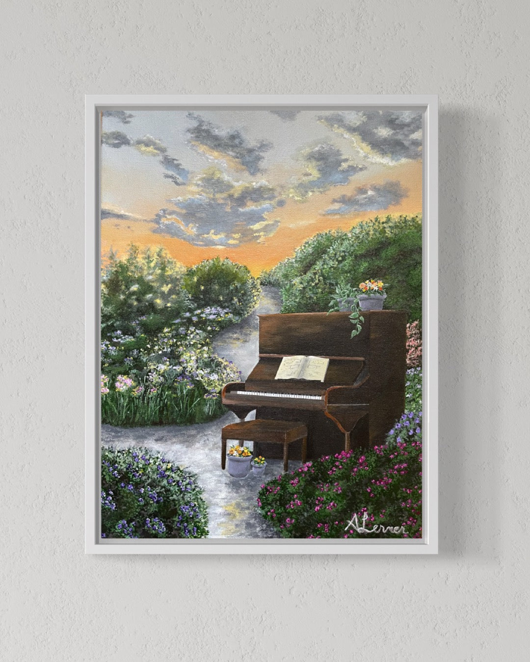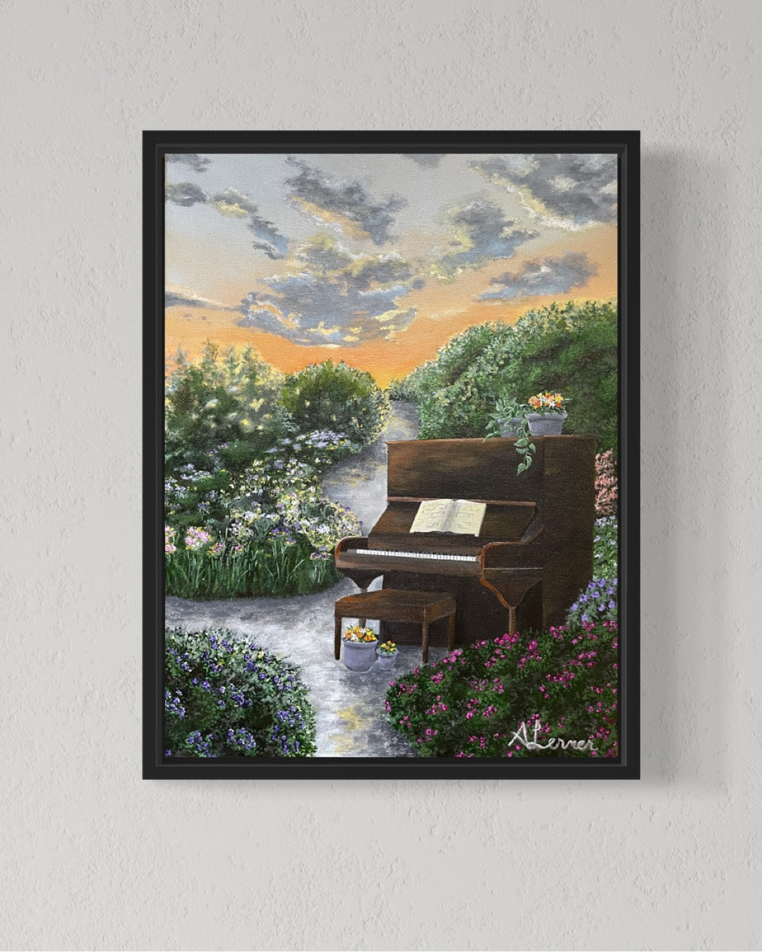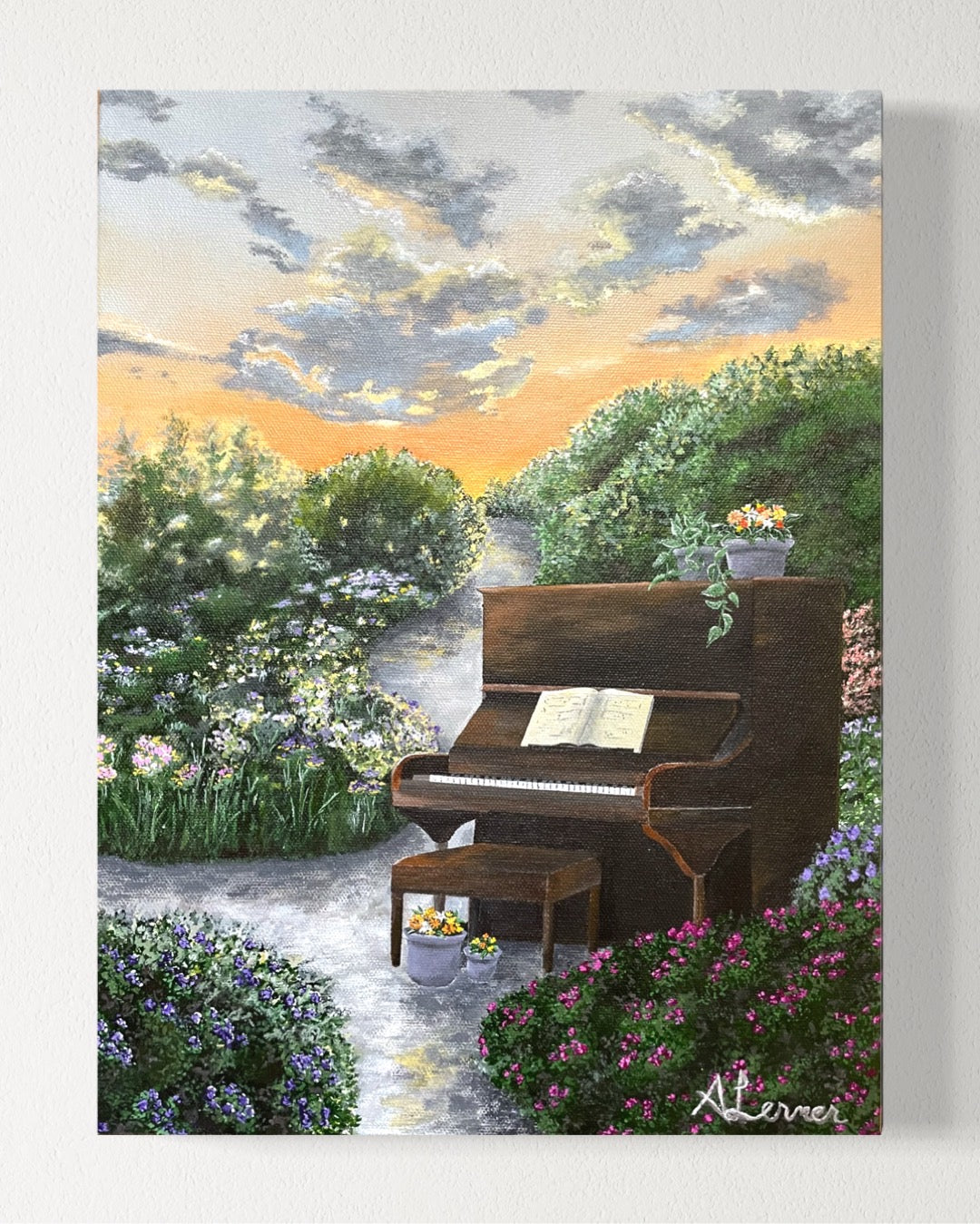 Experience the serene beauty of Sunset Melody, a stunning painting depicting a colorful sunset scene in a peaceful garden. Perfect for bringing a sense of tranquility to any room.